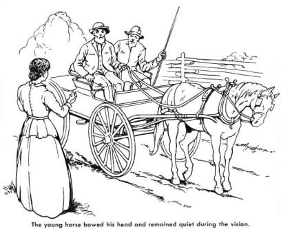 When Mrs. White sat down, the vision was over. Then the colt started without even a word from Elder White. Now he was as hard to manage as ever. Elder White had to hold the lines tight.